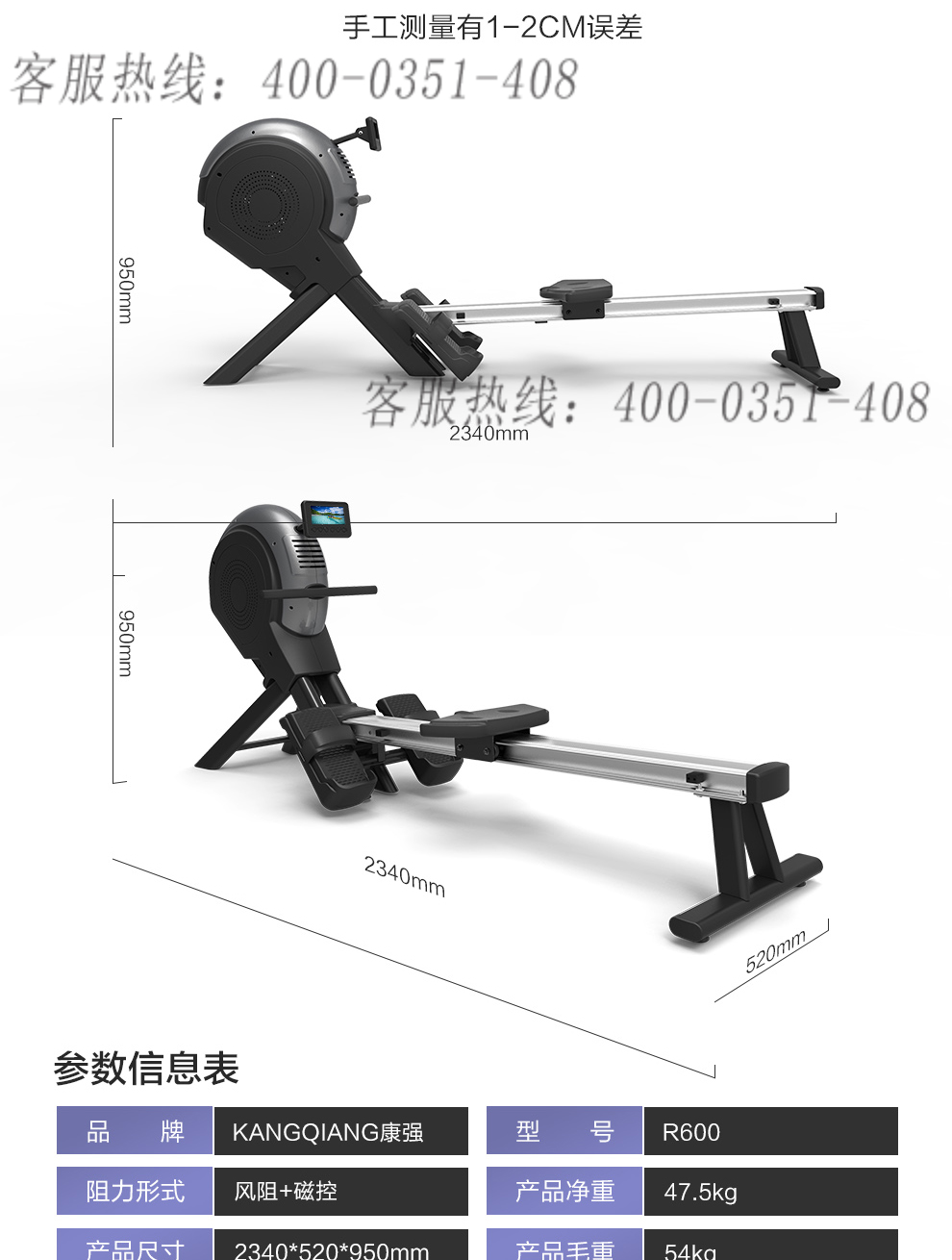 康强划船机磁阻R600室内划桨运动健身器材商用划船器商用磁控划船机 R600