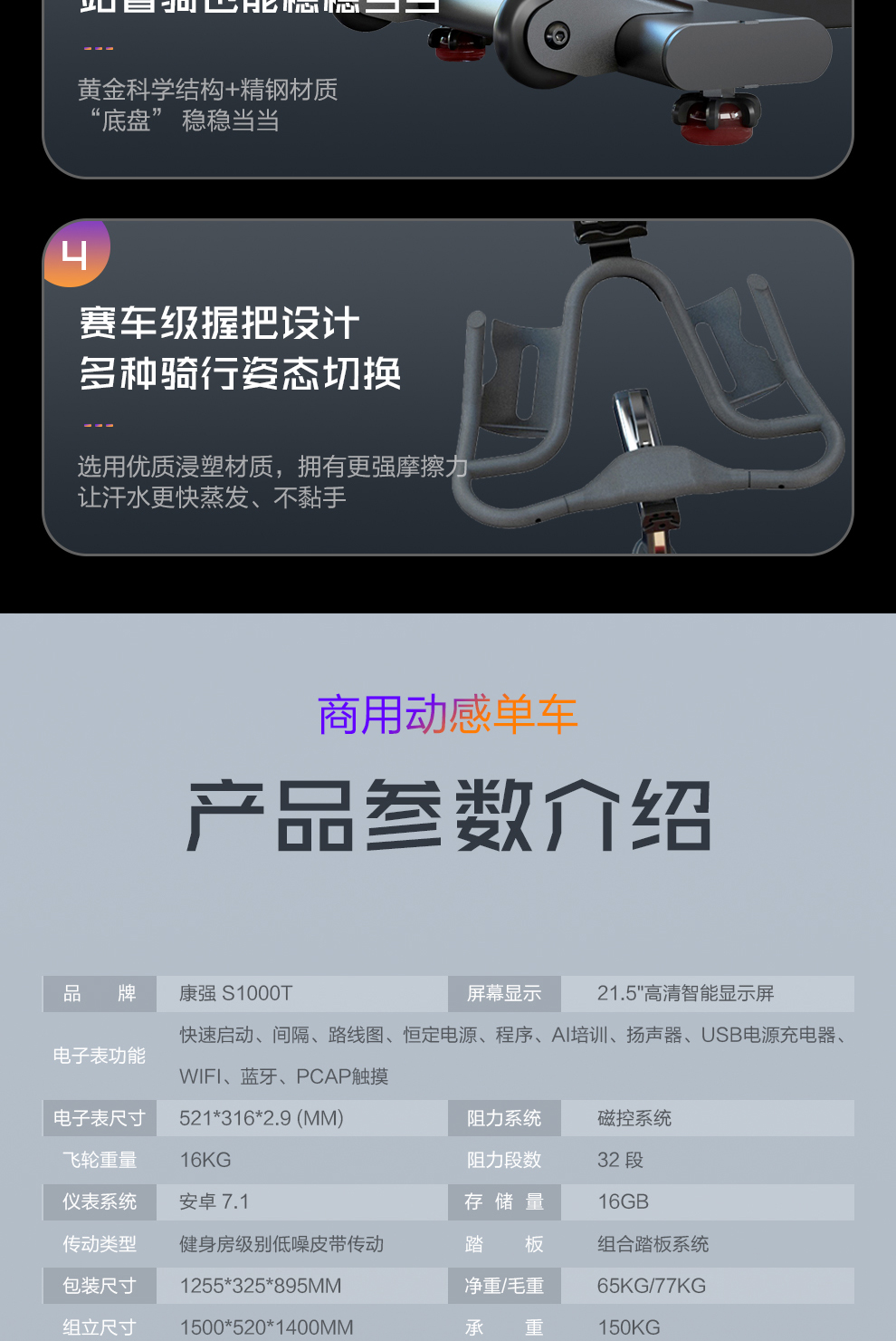 康强动感单车S1000T彩屏款家用商用级别健身车健身房专用健身器材